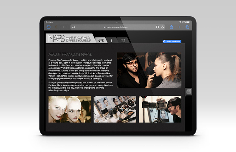 the interactive social media site, makeup your mind, was based on the instructional beauty bible by francois NARS with the same title. the micro site’s main purpose was to broaden the NARS audience and allow inclusive accessibility for every girl interested in beauty and glamour.