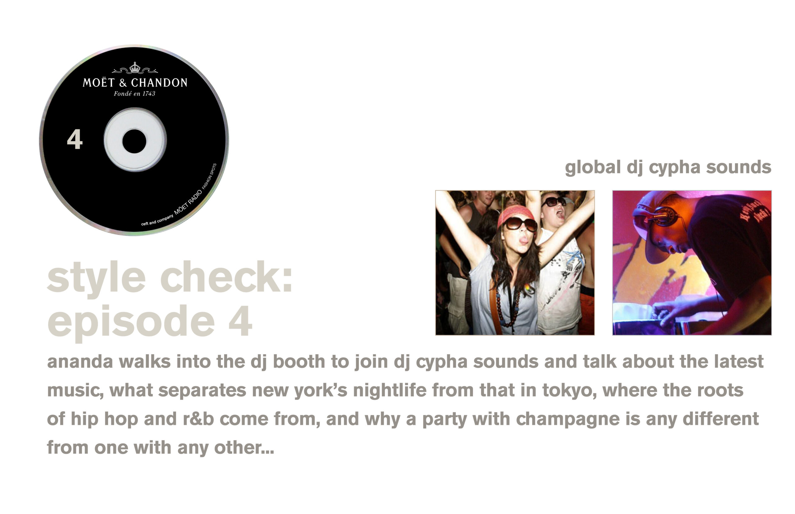 “style check” catches up with globe trotter DJ cypha sounds over a glass of moet nectar to talk about the girls, the drinks and the music. where does today’s popular hip hop really come from? is it ever ok to ask a DJ for requests? and finally, do DJ’s really get all the girls? click here to view all work for moet & chandon