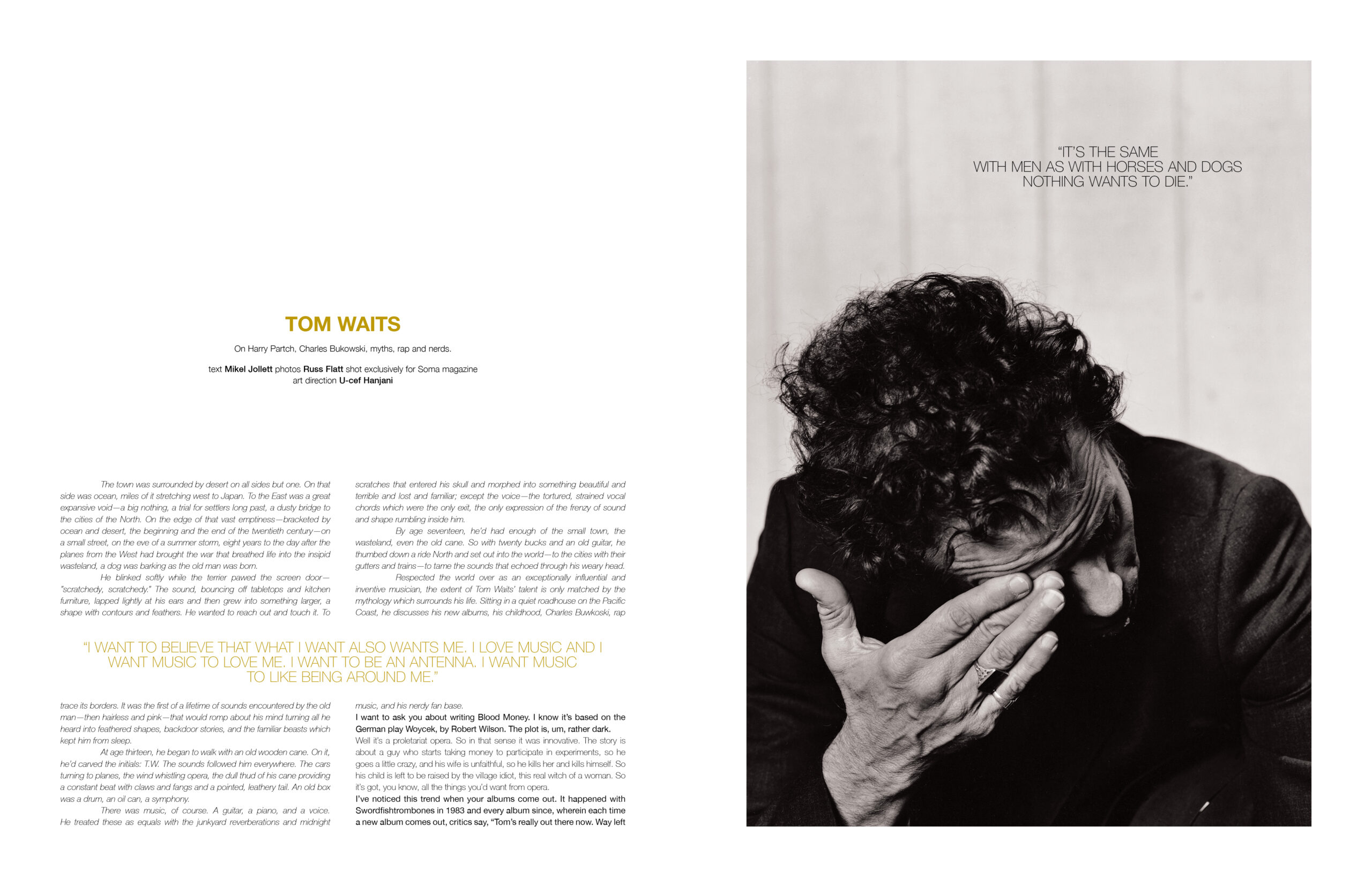 music legend tom waits gives intimate details and advice in this editorial story art directed by ucef hanjani and photographed by russ flatt for soma magazine. view all work for editorial / art direction.