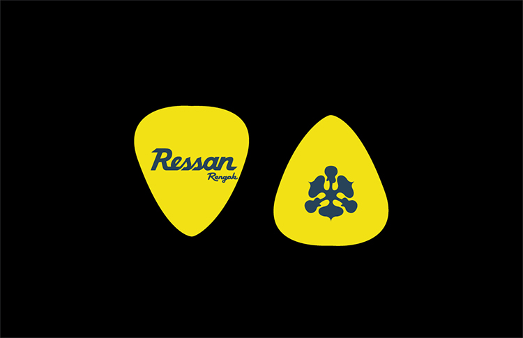 guitar picks sporting the ressan logo icon in brand colors; for the band use as well as promo giveaways.