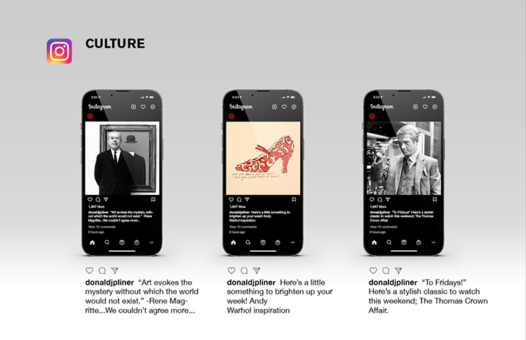 on the left: donald pliner’s instagram pre-takeover filled with product shots on nearly every post… on the right: a truer and more appealing representation of the brand with the implementation of our “brand world” categories.