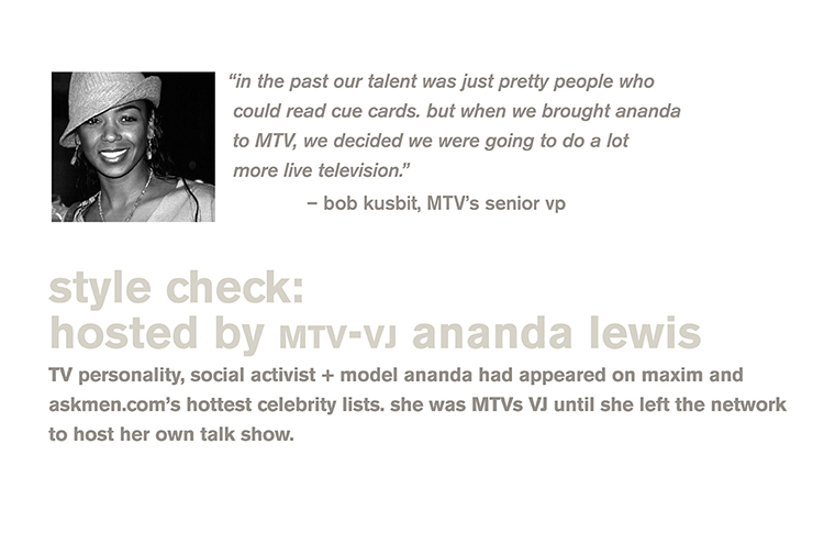 with that in mind, ceft and company created a series of two minute shows, where selected individuals were cast and interviewed by MTV’s VJ ananda lewis. the initial cast was a mixture of directors, architects, models, club owners and DJ’s who spoke about their work, something that was of interest to the particular audience.