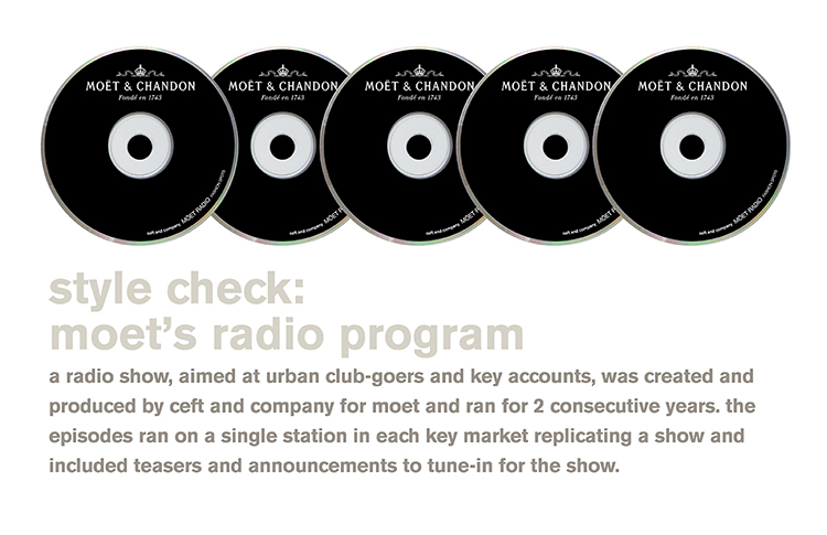 moet & chandon approached ceft and company for the creation and production of a radio campaign for their nectar imperial, specifically targeted at urban club-goers in their 5 key states. moet’s platform had always been in fashion and style with annual sponsorships of NY fashion week and the like.