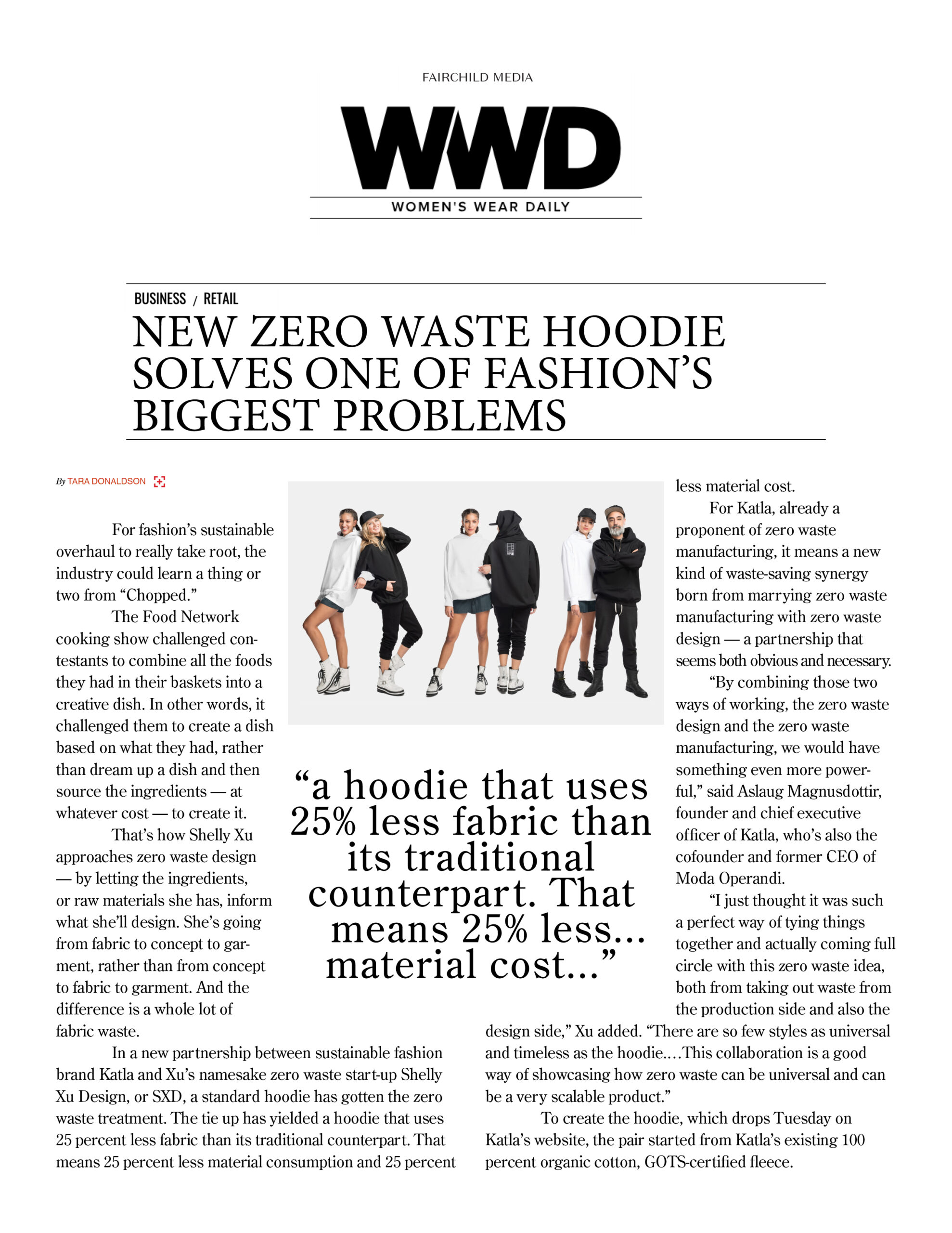 in a new partnership between sustainable fashion brand katla and xu’s namesake zero waste start-up shelly xu design, or sxd, a standard hoodie has gotten the zero waste treatment. the tie up has yielded a hoodie that uses 25 percent less fabric than its traditional counterpart. that means 25 percent less material consumption and 25 percent less material cost.