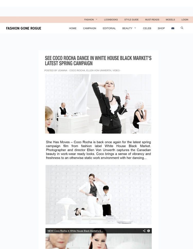 “she has moves – coco rocha is back once again for the latest spring campaign film from fashion label white house black market. photographer and director ellen von unwerth captures the canadian beauty in work-wear ready looks. coco brings a sense of vibrancy and freshness to an otherwise static work environment with her dancing.” – joanna, fashion gone rogue